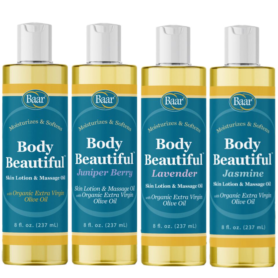 Body Beautiful is much more than just an after-bath moisturizer. For an intense skin conditioning treatment, add a splash of Body Beautiful to your bathwater. A few drops on a piece of cotton will remove makeup while moisturizing the skin at the same time. Pat the face, legs or underarm area with Body Beautiful after shaving to prevent razor bumps and hydrate the skin. Body Beautiful is one of the best oil combinations for a therapeutic massage because of its unique ability to penetrate deeply nourishing muscles, ligaments and tendons. Available in Original or with the ancient scent of Lavender or Jasmine. The new invigorating scent of Juniper Berry is now available in an 8 oz. size!