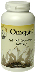 Omega-3 Fish Oil ConcentrateEssential Fatty Acids (EFAs) are necessary for health and are not manufactured by the body, therefore we need to have them in our diet. Omega-3 Essential Fatty Acids help improve skin and hair, reduce blood pressure, aid in the prevention or arthritis, lower cholesterol and triglyceride levels, and reduce the risk of blood clot formation. They are beneficial for candidiasis, cardiovascular disease, eczema, and psoriasis. EFAs aid in the transmission of nerve impulses and are needed for the normal development and functioning of the brain. |